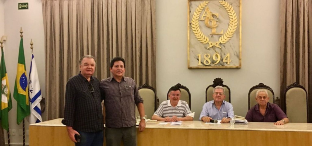 Teoberto Landim, na condição de ex-Presidente, deu posse ao professor Marcelo Braga, que renovou seu mandato e lidera agora a 23ª Diretoria da Academia Cearense da Língua Portuguesa. Sentados, outros três ex-presidentes — Ítalo Gurgel, Vicente Alencar e Valdemir Mourão — testemunharam o ato de posse, na última terça-feira, dia 28, no auditório do Palácio da Luz.